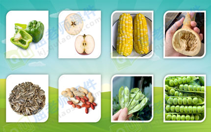 (二)探索其他果实的种子藏在哪里。 1. 教师:你们带来的果实有种子吗?.来源屈.老师教案网; 找一找它们的种子藏在什么地方? 2. 幼儿自由探索寻找种子,将找到的种子放在小蝶子里。教师帮助幼儿切开部分果实或敲开部分坚果的硬壳。 3. 教师:你带来果实的种子藏在哪里?你是怎样找到它的?种子是什么样子的?像什么? 4. 引导幼儿谈论并用语言描述自己用什么方法找到种子,以及种子藏在哪里。 (三)观察各种果实中的种子是怎么排列的。 1. 教师:我们找到了种了,再来看看植物和果实内的种子是怎么排列的。 2. 幼儿讲述,教师示范切开部分果实,引导幼儿观察果实中的种子的排列方式。 3. 教师:在种子不同的排列中,你又有什么新发现?