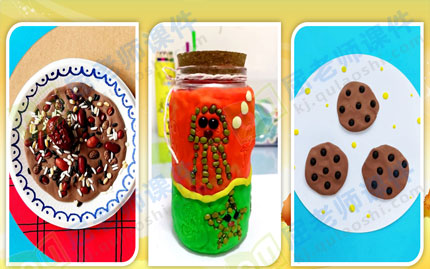 2、我来贴贴看 (1)幼儿自主选择材料,制作谷物贴画。 鼓励幼儿仔细观察各种谷物的颜色、形状等,并利用谷物固有的颜色、形状进行自由拼贴。 (2)分组探究装饰粘贴方式,幼儿自有操作。 提示:轻泥有粘性,可以用轻泥覆盖纸盘底部后用各类谷物粘贴装饰,也可用轻泥包裹小玻璃瓶后粘贴谷物。应该放手让幼儿完成创作。