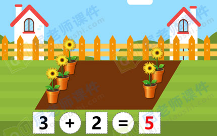 2、“造花坛”变式迁移,理解加法算式的意义。 (出示“花坛”)盆栽采购好了,现在可以装饰小区的“花坛”了。(教师先将3盆花放入“花坛”,再将2盆花放入“花坛”)你能说说怎么摆的吗? (1)引导幼儿说一说先放了几盆花,后来又放了几盆,最后一共放了几盆花。 (建议:引导幼儿用“先放了……又放了……一共放了……”的句式看图表述摆放“花坛”的过程,理解加法的意义。) 你们看,“花坛”里的盆栽数量是越来越多了,还是越来越少了?合并后的数量可以用什么方法来计算?(加法)怎么列算式呢? (2)出示算式填空图(如图:□○□○□),请个别幼儿将算式填写完整后交流讨论:先放了3盆花,用几来表示?(用数字“3”表示。)又放了2盆花,用几表示?(用数字“2”表示。),一共放了5盆花,可以怎么记录?(把原来的3盆和后来的2盆合在一起是5,用数字“5”表示。) 你能看着这个加法算式来完整说一说吗? (3)引导幼儿边用动作演示边表述加法算式的含义,即先放了3盆花,又放了2盆花,一共放了5盆花。 生活中,还有哪些事情可以用“3加上2等于5”的算式表示? (建议:引导幼儿表述加法的意义,理解一个算式可以代表许多同类事件。)