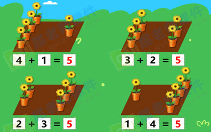 3、幼儿个别化操作,尝试列5以内的加法算式。 (提供PPT图片)小区的花坛还有很多没有装饰好呢,请你们去帮忙好吗?请你们先说一说怎么放的(先放几盆花,又放几盆花,一共放几盆),再将算式填写完整。 (1)幼儿自主操作,教师观察与分层指导。 (建议:如果幼儿不能列出加法算式,引导幼儿说一说“先放了几盆花?又放了几盆花?最后一共放了几盆花”,再引导幼儿观察一部分记录一部分,最后计算总数并记录。如果幼儿能说出图意,计算出了总量,但不会列加法算式,引导幼儿对应着记:先放了几盆(记下数字),又放了几盆(记下数字),最后一共有几盆(算出总量记下数字),记完之后再说一说算式的意义。如果幼儿能完成列式,引导幼儿结合图意演一演,说一说所列算式表示的意义,同时引导幼儿根据自己列出的加法算式说一件符合这一算式的其他事情。) (2)引导幼儿说一说自己列出的算式,再演一演,表述算式的意义。 谁来分享一下,你是怎么做的? 查看课件:大班数学课件《小区花坛》PPT课件 |