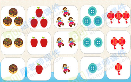 2、帮新年老人装礼物——学习按点子数目匹配相应数量的实物。 教师:马上就要到新年了,还有许多小朋友没有礼物呢,新年老人想请你们帮他把礼物装进宝贝罐里,你们愿意吗?(激发幼儿参与操作的兴趣) 教师出示贴有3个点子的空罐子和小铃铛、糖果等礼物:这个罐子里可以装几个什么礼物呢?你怎么知道的?(鼓励幼儿大胆地说说自己的想法) 教师:谁来试一试给罐子里装上礼物? 请个别幼儿观察宝贝罐上点子的数目,根据点子数目在罐中放相应数量的铃铛、糖果等。 教师:她装了什么礼物在罐子里?每种礼物都是几个?她放得对吗?你怎么知道的?(引导全体幼儿检查罐子中的礼物是不是都是3个, 并引导幼儿说出“罐子上有3个点子所以要放3个铃铛、3个糖果”) 教师:我们都去帮新年老人装礼物吧!每个人拿一个宝贝罐,先看看罐子上有几个点子,再选你喜欢的礼物,想一想装几个?一边放一边说“×个点子放几个××”。 教师请每位幼儿为1~2个宝贝罐放东西,引导幼儿选择贴有不同数目的宝贝罐,再拿取礼物放入罐子中。鼓励幼儿一边操作一边讲述“×个点子放×个××”。 教师:你们在宝贝罐里装上礼物了吗?你们是怎么装礼物的?装了几个什么礼物?(引导幼儿说一说:先看宝贝罐上面的点子,再按点子数目拿取相同数量的东西放进宝贝罐中。教师和幼儿共同检查个别幼儿礼物放得正确与否)