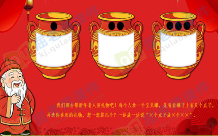 查看课件:小班数学课件《宝贝罐》PPT课件 活动目标: 1、能够手口一致地点数3以内物体的数量,学习按点卡上的数目匹配相应数量的实物。 2、能边操作边讲述“×个点子放×个××”。 3、愿意参加操作活动,能按要求收拾整理活动材料。 活动准备: 环境准备:班级创设过新年的环境。 材料准备:PPT课件,师幼共同收集各种罐子(贴有3以内的点子,数量为参加活动幼儿人数的2倍);糖果、铃铛、纽扣、实物小玩具若干;一个装有2个小皮球、2个小汽车的罐子(上面贴有点卡2);3个纸箱(上面分别贴有1、2、3个点子)。 经验准备:幼儿能说出礼物的名称;能手口一致地点数3以内的数量。