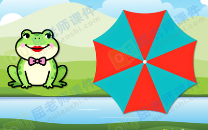 4、幼儿反思自己的歌唱情况。 教师:大家都学会唱这首歌曲了么?我们来验证一下哦! 会唱歌曲是和老师唱得一模一样哦! 5、游戏:青蛙躲进大洞洞。 (1)教师出示太阳伞,幼儿了解情境“妈妈要找一找,躲进了一个大洞里的小青蛙”。 (2)幼儿站在伞边,双手抓紧太阳伞唱1遍。歌曲结束后,幼儿躲到太阳伞下静止不动。教师戴着蛇的头饰,掀开太阳伞,小青蛙看见是蛇,则迅速逃跑(跑回座位)。可以根据幼儿的情况玩两遍左右。 查看课件:小班音乐课件《小青蛙躲猫猫》PPT课件 |
