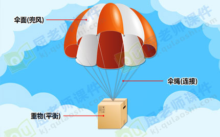 活动过程: (一)导入部分 1、教师播放跳伞运动员视频,提问:“这个人为什么能慢慢从天上飘下来?”出示自制降落伞成品,演示下落过程,引发兴趣。 2、教师拆解降落伞并提问:“降落伞有哪几部分?猜猜每部分的作用。”(伞面兜风、伞绳连接、重物平衡)。