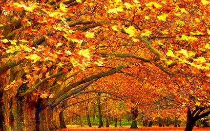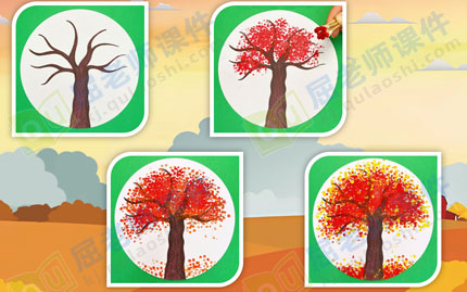 活动过程: 1、出示PPT组图“秋景”,引导幼儿欣赏秋天的树林。 (1)观察秋天树林的色彩。 这是什么季节?你是从哪里看出来的?(树叶的颜色) 秋天的树林哪里最美? 小结:秋天的树林是彩色的,树叶有红色、黄色、绿色等等,五彩斑斓真美啊。 (2)引导幼儿观察树木的树干、树冠等,感知树木的形象和结构。 这些树除了颜色不同,还有其它不同的地方吗?