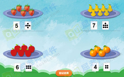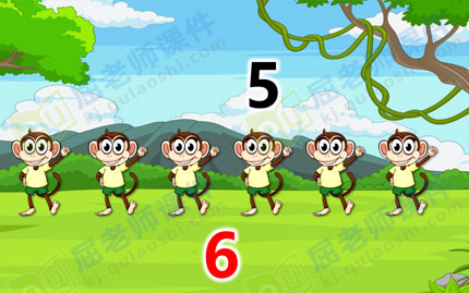 (二)展开部分 1、认识数字“6”“7” 让幼儿初步理解5添上1是6,6添上1是7。 (1)教师先出示5张小猴子图片,再出示1张小猴子图片,引导幼儿数一数共有几只小猴子。 教师:“5只猴子可以用数字几表示?再增加1只呢?可以用数字几表示?” (2)教师再出示1张小猴子图片,请幼儿数一数变成了几只小猴子。 教师:“6添1是7。7只小猴子可以用数字几表示?” 2、数一数7以内的数。 教师:“小猴子在集市上买了许多好吃的水果,装在不同的盘子里。它想请小朋友帮它数一数,它的盘子里有几个水果?请小朋友数清后贴上相应数量的点卡和数卡。” 3、幼儿操作,教师观察指导。 教师小结:“6个苹果可以用6个点和数字6表示。”“7个梨子可以用7个点和数字7表示。”