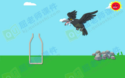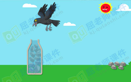 3、教师出示乌鸦画面 师:“有哪个小朋友知道这只鸟叫什么名字?”(乌鸦) 4、播放PPT故事画面,教师讲述。 师:“乌鸦飞了好远的路,口渴了,到处找水喝,它飞着飞着看见了一个瓶子。”(教师出示瓶子放在桌子上有小石子的位置)瓶子里有水,乌鸦就把他的嘴巴伸进瓶子想喝水。小朋友乌鸦喝到水了吗?(请幼儿观察)他为什么喝不到水呢?请小朋友帮助乌鸦想想办法好吗?小乌鸦在瓶子周围转悠着看到许多小石就用他的嘴巴叼起小石子一个一个的放进瓶里(请小朋友帮助乌鸦把小石子放到瓶子里,并且观察瓶子里的水有什么变化)瓶子里的水渐渐地升高了我们看这时候乌鸦有没有喝到水(请幼儿观察乌鸦喝倒了水) 师:“小乌鸦聪明吗?我们小朋友在以后遇到困难要怎么去做?” 师总结:我们以后遇到问题要动脑筋、想办法,做事要有耐心,最后一定是会成功的,